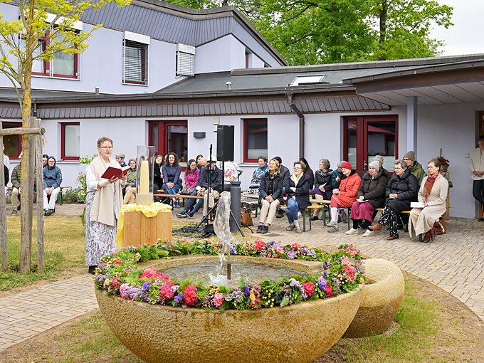 Während der Einweihung, die sich nicht nur auf den Brunnen, sondern auch auf gesamte Magda-Hummel-Haus beziehen sollte, wurde das Wasser als Leben spendendes Elixier durch viele künstlerische Beiträge bedacht. Eingebettet in eine klassische sonntägliche Morgenfeier erklang ein A-capella-Chor, es wurden Gedichte vorgetragen und eine Gruppe führte einen Quelltanz um den Brunnen auf.