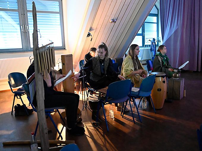 Gerade bei den unterschiedlichen Masken ergibt sich so manche Überraschung … welche Wesen sind hierbei entstanden und wie kann man ihnen für die einzige Aufführung im Wilhelm-Meister-Saal der Gemeinschaft Altenschlirf Leben einhauchen, auch mit Hilfe der musikalischen Begleitung? Kaum einer der dreizehn Teilnehmer stand je zuvor auf einer Bühne und so gestaltete sich dieses soziale Projekt sehr kreativ und spannend. “Nur, wenn wir zusammenhalten, wird es gelingen!”, weiß Almut König-Kippenberg aus langjähriger Erfahrung, konnte die Mitwirkenden noch in der tänzerischen Bewegung und Atmung entsprechend schulen und gegen das Lampenfieber verteilte sie in bewährter Tradition einen süßen Schaumkuss als Nervennahrunng kurz vor dem Auftritt.