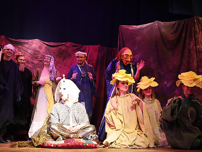 Ein großer Adler führte den verzagten Prinzen schließlich zu der gesuchten Blume, die ihm Samen und Zuversicht schenkte, er mußte sie zum Glück gar nicht pflücken und kehrte gestärkt in sein Königreich zurück, was mit einem ausgelassenen Fest gefeiert wurde! Schon schloß sich der Vorhang, das Pubikum dankte mit reichlich Applaus und betrachtete anschließend noch ausgiebig die beeindruckenden Masken, die eigens zum Entdecken und Bewundern am Bühnenrand abgelegt waren.