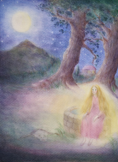 Sie ist in Wirklichkeit eine weise Frau, die in der Einöde lebt, zusammen mit einer verstoßenen Königstochter, derer sie sich angenommen hat. In der Obhut des steinalten Mütterchens dient diese als Gänsehirtin und lebt ein bescheiden Leben. Ihr Anblick ist nicht der einer Königstochter. So kann der Jüngling ihre wahre Schönheit nicht erkennen und zieht, ohne sich auch nur einmal umzublicken, mit seinem Lohn, einem smaragdenen Gefäß, von dannen. Er ahnt nicht, dass sein Schicksalsweg ihn wieder zurückführen wird in diese Einöde.