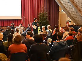 Im Rahmen der Mitwirkungskonferenz informierte Bürgermeisterin Astrid Staubach in einfacher Sprache über die geplanten Windenergieanlagen rund um Herbstein, Altenschlirf und Stockhausen und beantwortete offen die Fragen der Teilnehmenden.