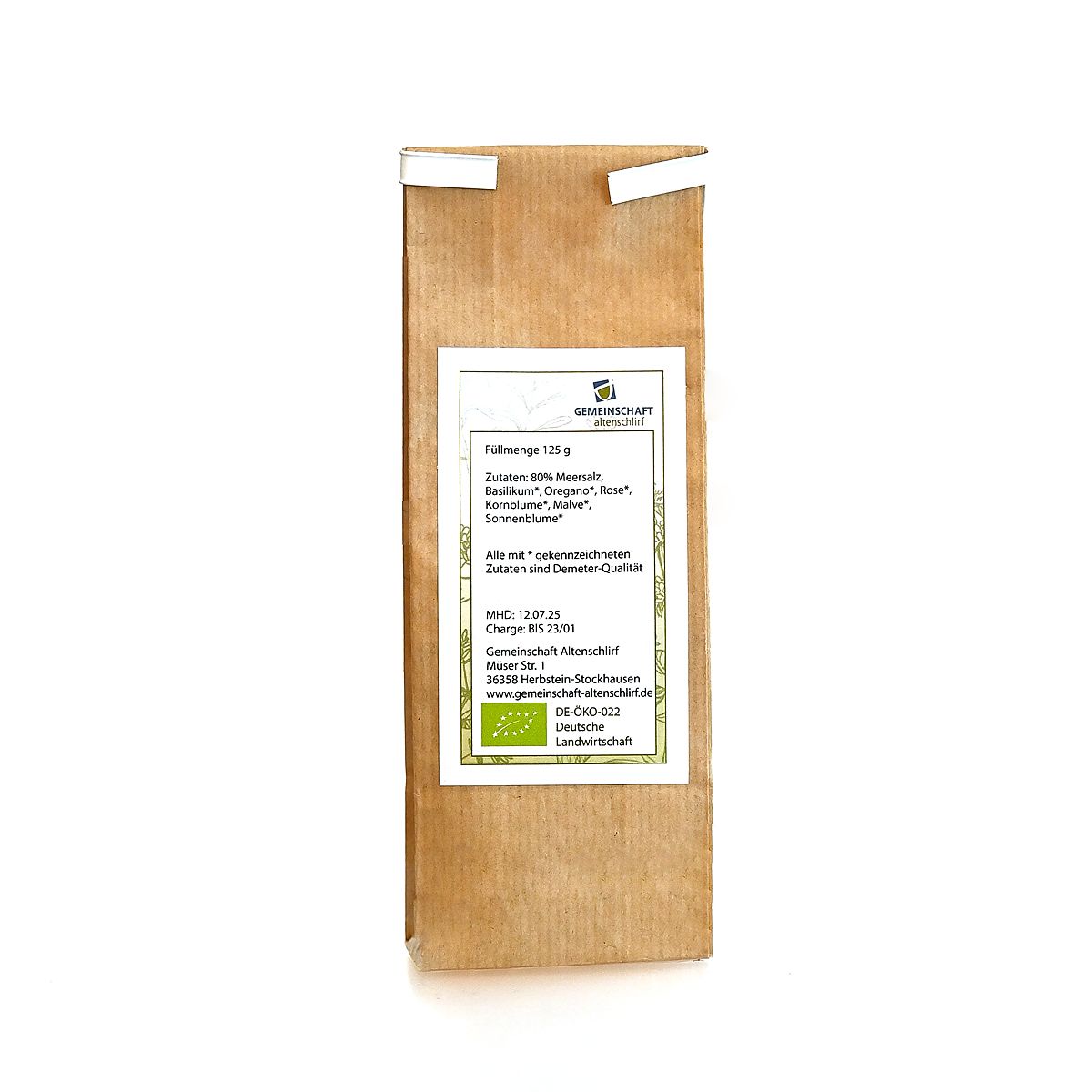 Zutaten: 80 % Meersalz, getrocknete Kräuter und Blüten (Basilikum*, Oregano*, Rose*, Kornblume*, Malve*, Sonnenblume*)